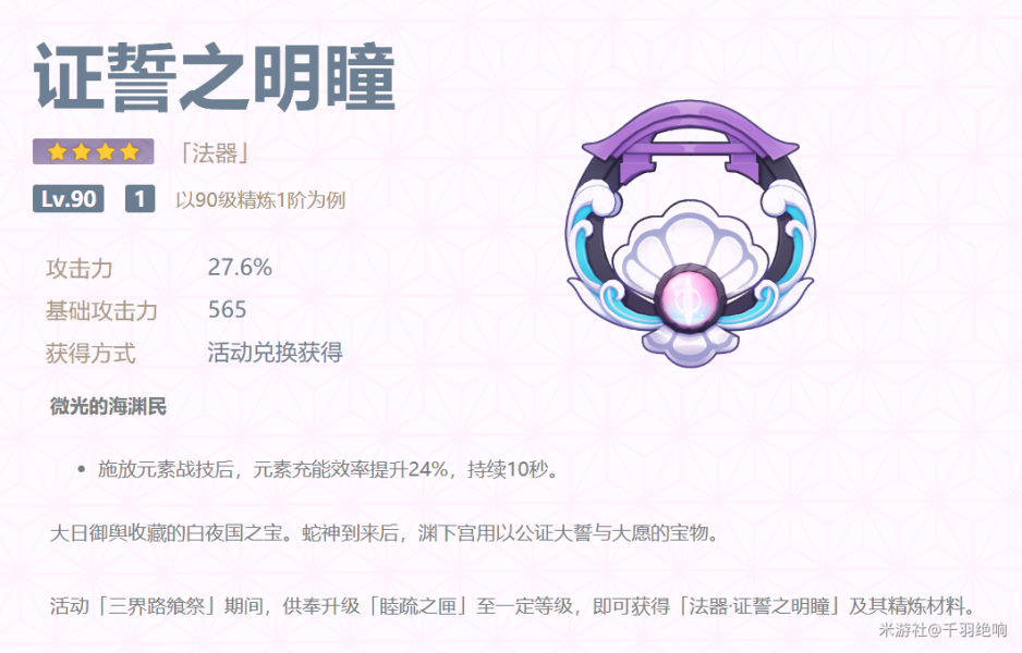 至于“证誓之明瞳”该武器可以携带,但在有更好选择的情况下其位置就显得稍微有些尴尬。但优点是它可以加快充能效率,在暴击爆伤合适的情况下携带满精炼的此法器还是很不错的。