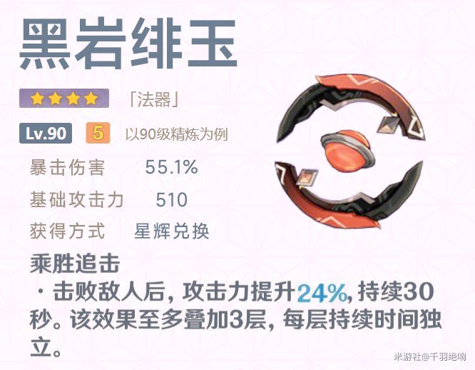 至于另一件4星爆伤法器“黑岩绯玉”千羽为什么不谈呢,因为,这武器的获取方式非常尴尬,要用星辉兑换,就属于那种,平民不会换,氪佬不会看的武器。当然,如果你能搞出来一件满精炼的,也是可以使用的,黑岩系武器的上限都很高的。但对大怪就不好用了,你可能半天都叠不满被动。