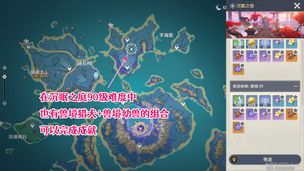 推荐在黄金王兽所在的小岛周围完成(有3个点位),或者清籁岛的圣遗物副本「沉眠之庭」90级难度副本中完成。