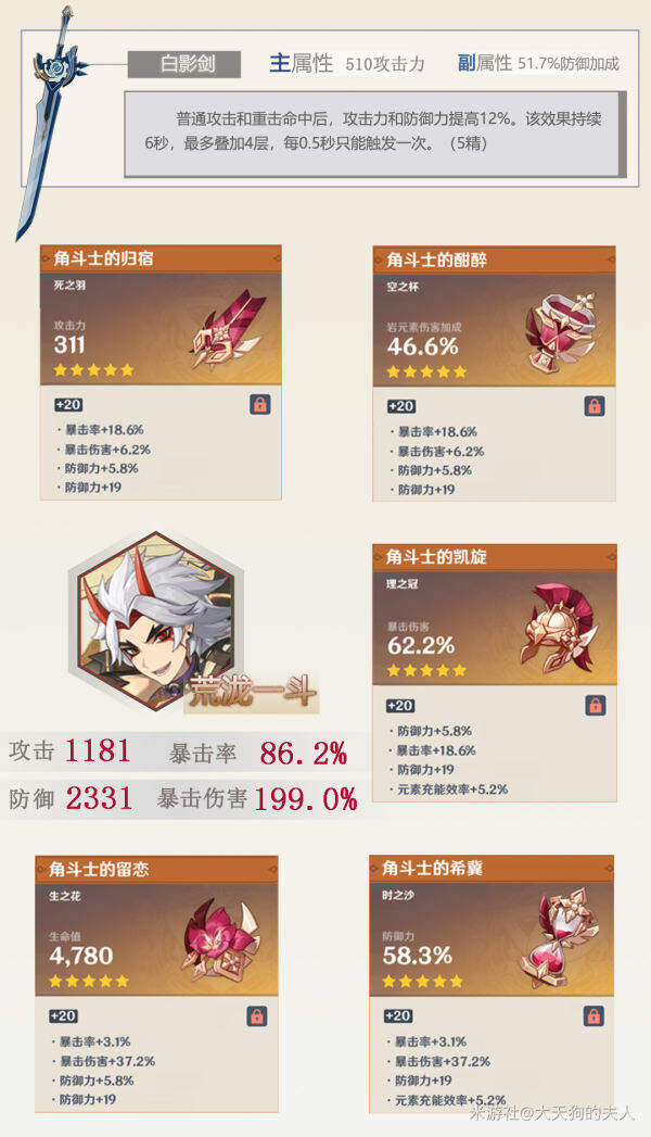 2. 荒泷一斗,5精白影剑,「角斗士」4件套毕业面板: