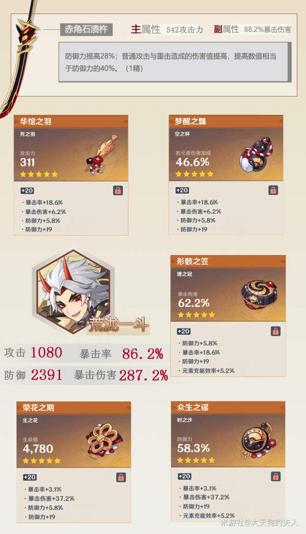 5. 荒泷一斗,1精赤角石溃杵,「华馆」4件套毕业面板:
