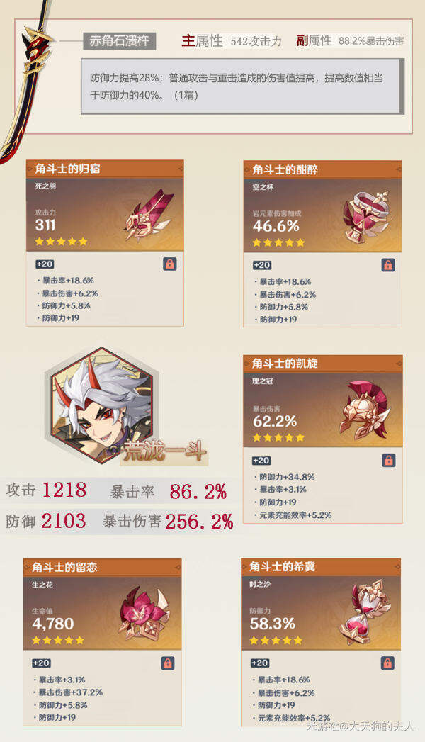 6. 荒泷一斗,1精赤角石溃杵,「角斗士」4件套毕业面板: