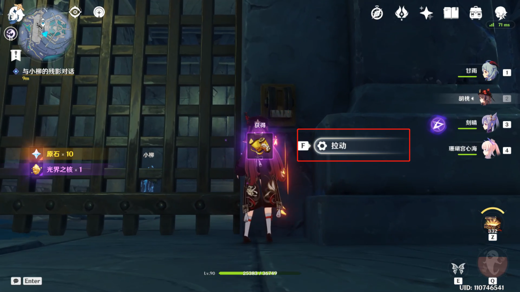 拾取宝箱后,拉动密室中的拉杆机关。开启栅栏门后,与NPC小柳进行对话