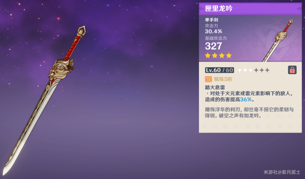 稻妻锻造武器,拥有强大的自充能能力,对于拥有超优秀双暴副词条的旅行者来说,可以选用。优点很明显,班尼特的Q几乎是不可能断,缺点也很明显,用了它你就得疯狂堆副词条,甚至比上面的匣里龙吟要求还要高,因为攻击白值比龙吟低,也没有增伤效果。