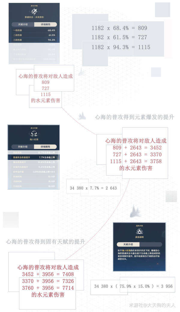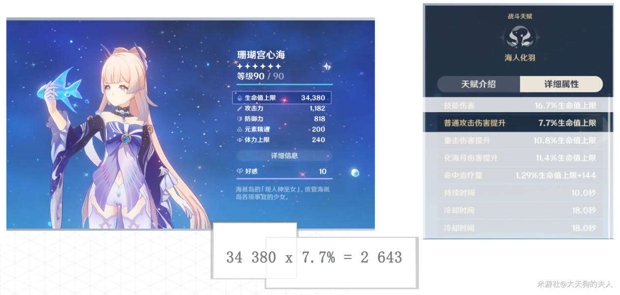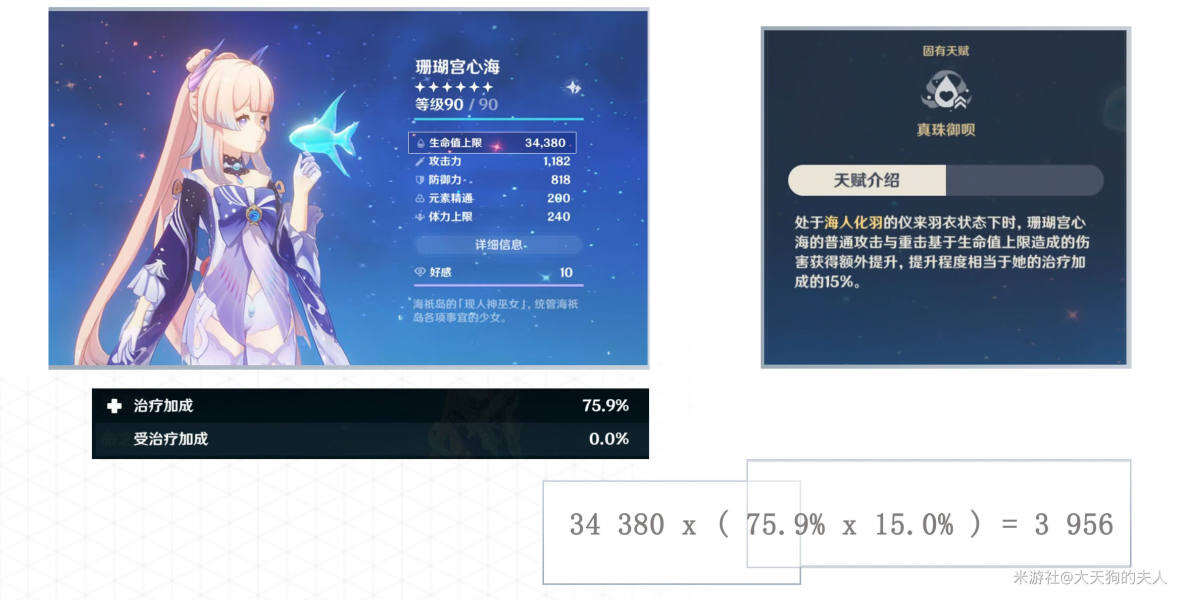 固有天赋对普通攻击的提升和心海的生命值、治疗加成有关。75.9%治疗加成、34 380生命值的心海,普通攻击会得到34 380 x ( 75.9% x 7.7% ) = 3 956的提升。