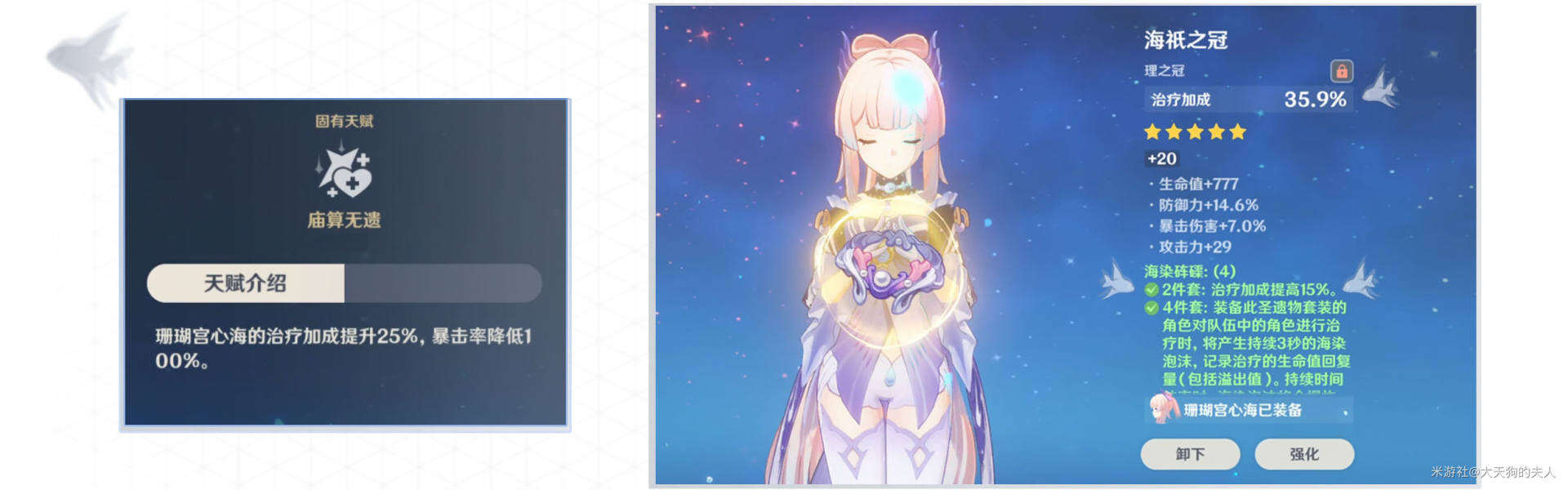 固有天赋「庙算无遗」让心海自身拥有25%的治疗加成,满级圣遗物可以提供心海15%+35.9%=50.9%治疗加成,心海一共拥有75.9%治疗加成。