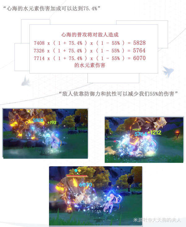 最后,再经过“水元素伤害加成”、“敌人防御力”、“抗性”影响下,心海普通攻击对敌人造成5 828,5 764,6 070的水元素伤害。