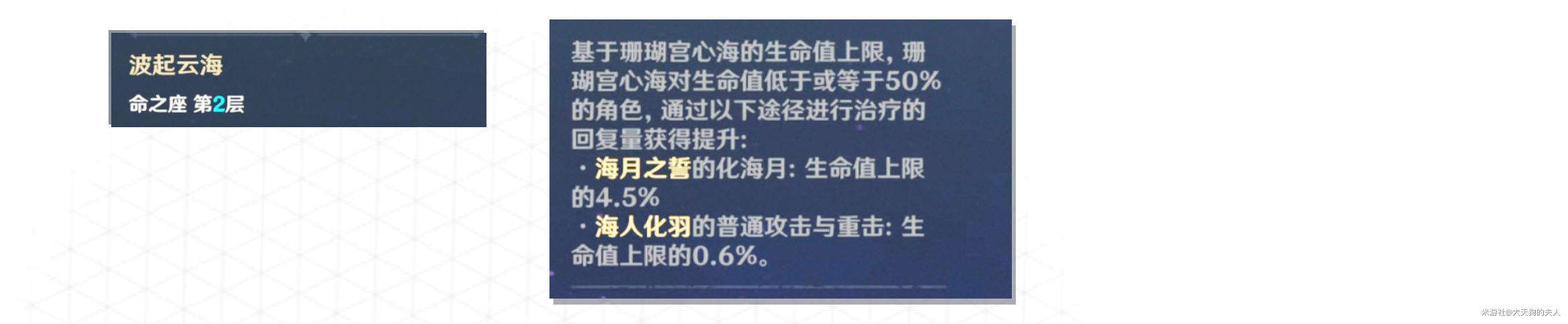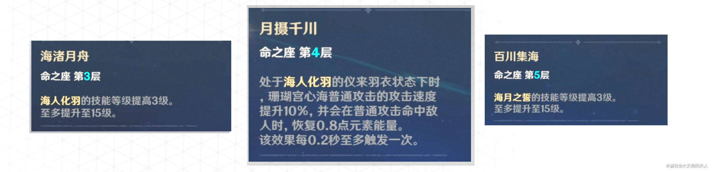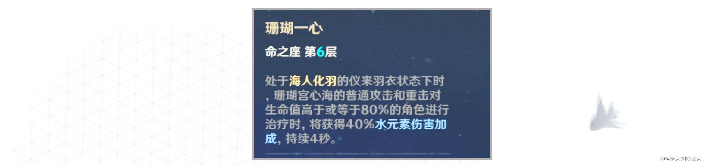 心海,1命,元素爆发里的普攻多了一段游鱼伤害。游鱼伤害不是普通攻击,它不会受到元素爆发和固有天赋的增益,也不会受到不灭月华武器效果中的增益。