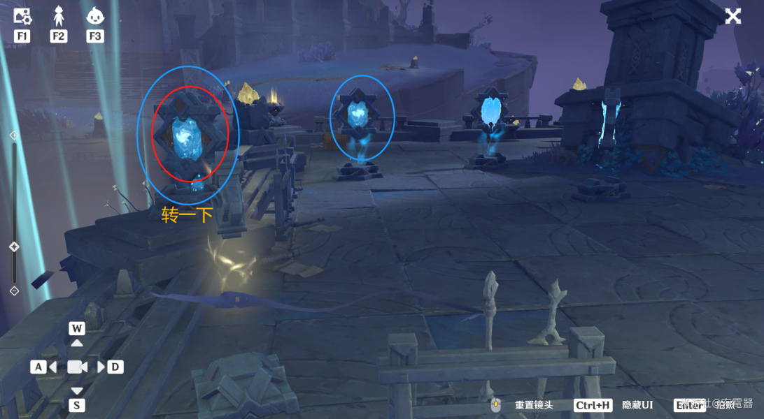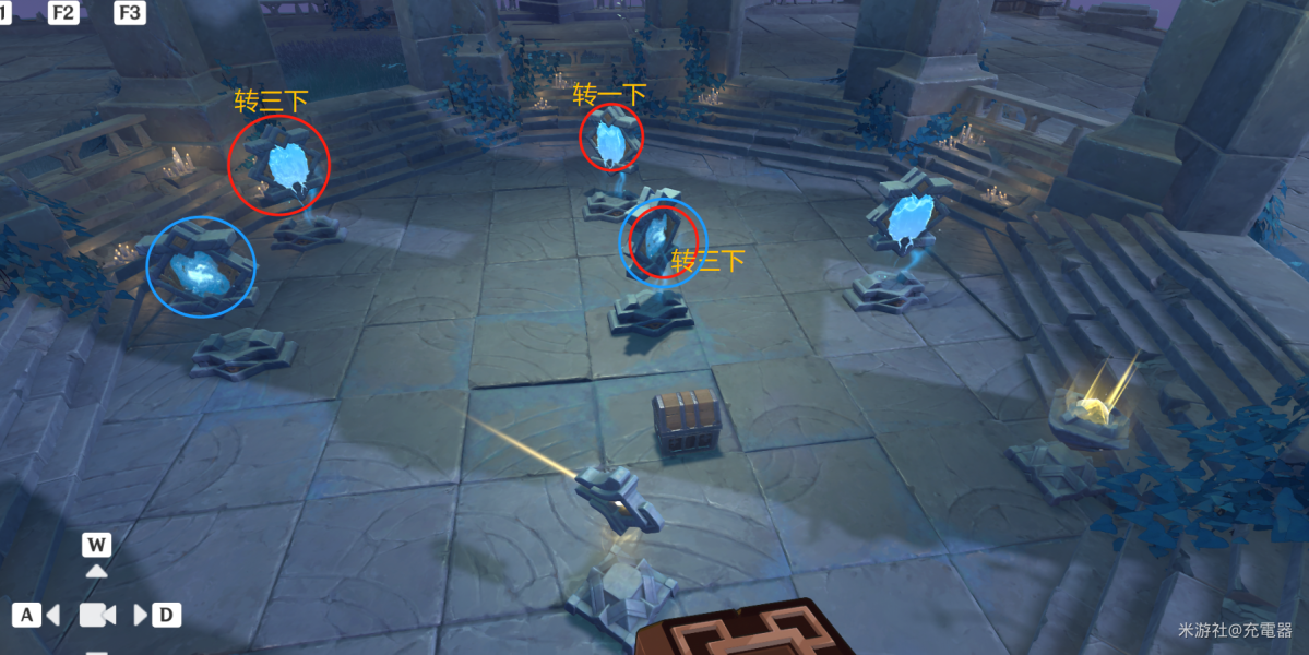 如图,标蓝圈的两个机关是水面镜。标红圈的机关转一次角度