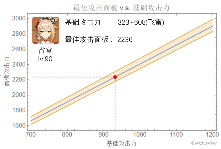上面第一张图给出的蓝线就是动图中峰值位置随基础攻击力变化的情况,这里为了方便看,纵轴没有再用数值权重表示而是直接换成了更方便看的百分比攻击力。这里百分比攻击力直接看还是不够方便,我们转化为看人物最终的攻击面板会比较容易,因此图二则是直接将横轴的百分比攻击力换算为了人物的攻击面板。两个图中有一个橙色的带,分别是以2.7*30和3.9*30来计算数值权重得到的上界和下界,即攻击不必严格落在蓝线上,带的范围内都是参考面板。