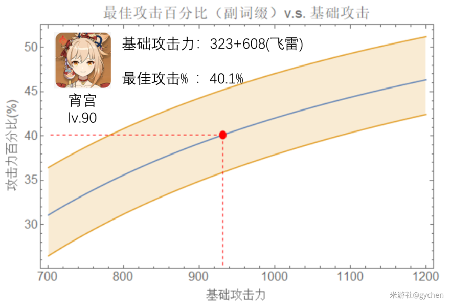 就是符合这里计算中说到的突破加暴击,专武飞雷弓为66.2%的暴伤武器的角色。这里找到宵宫的基础攻击力 323+608 即可找到图中对应的最佳攻击百分比和对应的攻击面板。其他同类型角色也可以通过这种方式使用上图来估算其最佳攻击面板。
