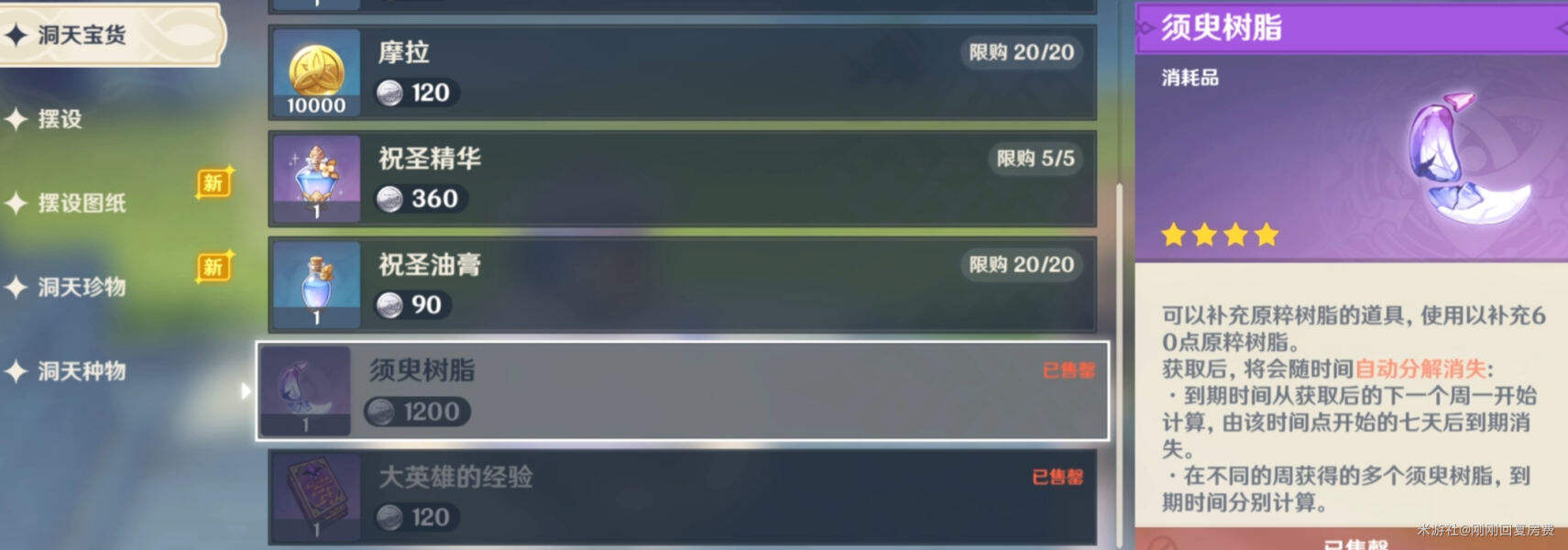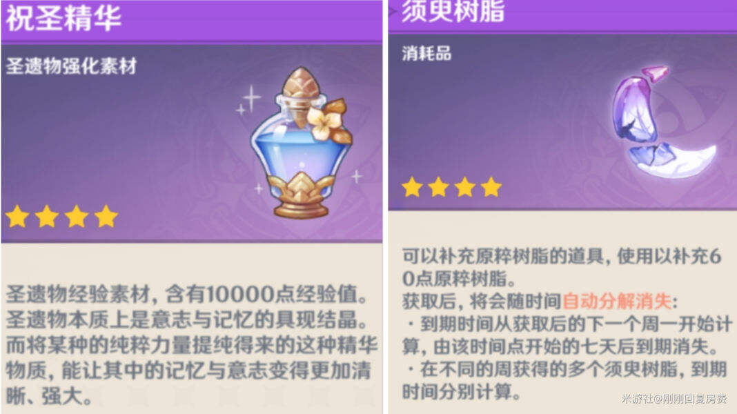 2.尘歌壶到达6级每周可获得:一个须臾树脂(价值60体力),到达8级后又可兑换5瓶祝圣精华+20瓶祝圣油膏(总计10万圣遗物经验)