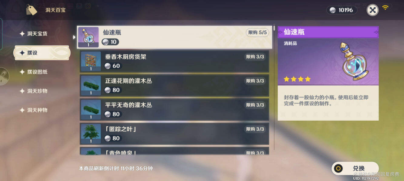 仙速瓶尘歌壶阿圆兑换(建议每天都换掉,直到尘歌壶10级)。另外尘歌壶升级后能领取仙速瓶+60原石,总共获得600原石。