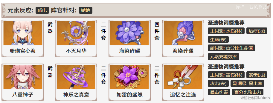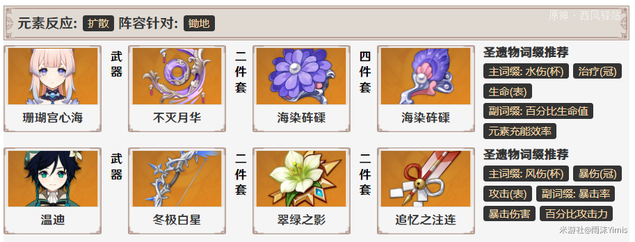 最经典也是目前心海使用最多的阵容,一般而言在这个阵容中琴为2命,其加攻速效果能够给心海提升非常高的伤害。万叶不需要跟雷神车一样堆生命值防暴毙了,有条件带精风爆补一下输出。只有钟离硬性要求带西风给充能。