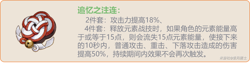 既然元素爆发的伤害不够高,那么干脆就改变元素能量的作用,让它为倍率最高的重击提供辅助。圣遗物「追忆之注连」的4件套效果,是消耗元素能量,从而带来10秒的普攻、重击、坠击伤害提高50%,是目前圣遗物中对重击增伤幅度最高的。