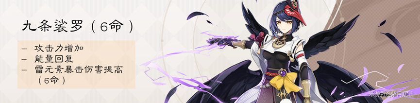 雷元素专用拐-九条裟罗,元素战技与元素爆发都会为自己的角色带来提高攻击力的「天狗咒雷」,并且解锁6命后,会为「天狗咒雷」状态下的角色提高60%雷元素暴击伤害,是所有雷元素角色的好助手。