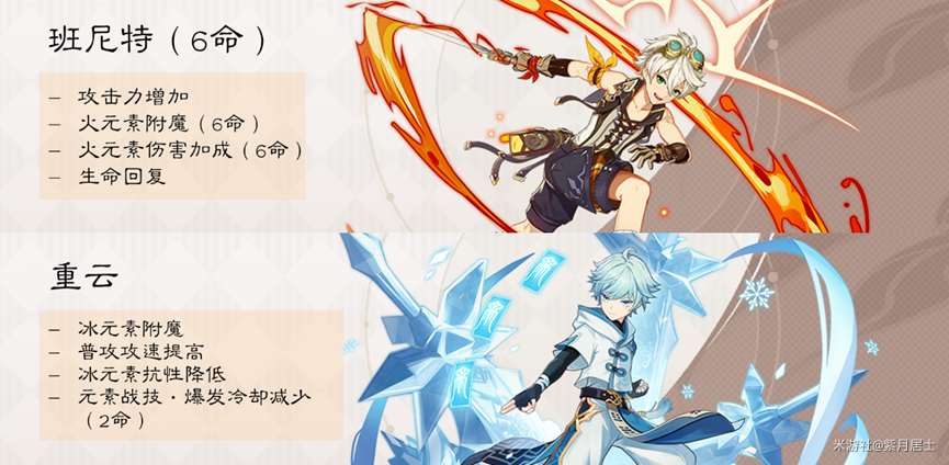 班尼特(6命)和重云(0命即可)都能够为近战角色带来元素附魔,由于附魔优先级为火>冰>雷,因此他们二人的附魔都能覆盖刻晴自身的雷元素附魔,从而让刻晴可以进入火/冰队伍体系,享受人上人的元素加成。
