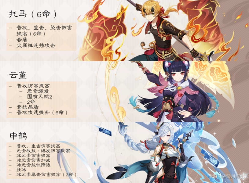 托马的元素战技·爆发、云堇的元素爆发以及申鹤的元素战技,都能为所有角色带来普攻伤害的提升。此外,托马可以提高重击和下落攻击伤害、申鹤可以为角色的冰元素伤害带来巨幅提升。
