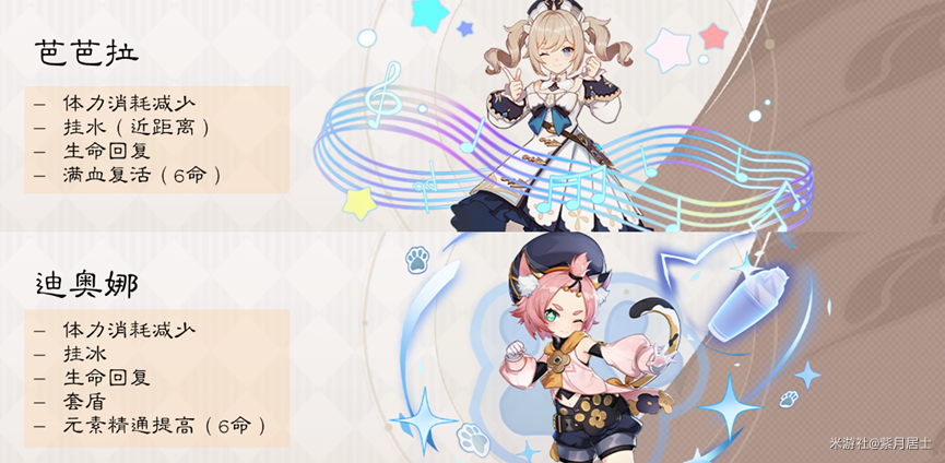 芭芭拉和迪奥娜的元素战技分别可以为站场角色提供12%/15秒,10%/12秒的体力消耗减免。此外,芭芭拉的固有天赋2可以使持续时间最多延长到20秒。