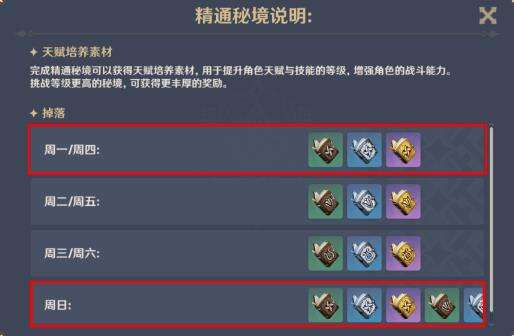 该秘境每天轮换挑战成功的奖励,其中「自由」系列素材仅在每周一/周四/周日可获得;特别是周日,三种天赋升级素材都可选择获取,旅行者一定要看清是哪个后再进行挑战。