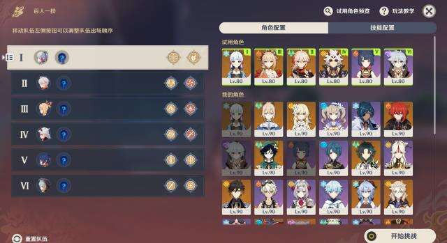 2. 挑战中,冒险者可以将活动提供的试用角色与自己拥有的角色编成6组搭档队伍进行挑战。每支队伍可以编入至多2名角色及2个「秘技」。旅行者可以在战斗中切换队伍,队伍会依照编成时的编号顺序依序循环登场。