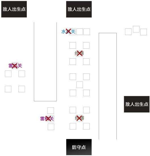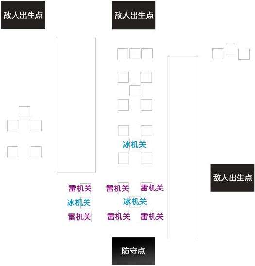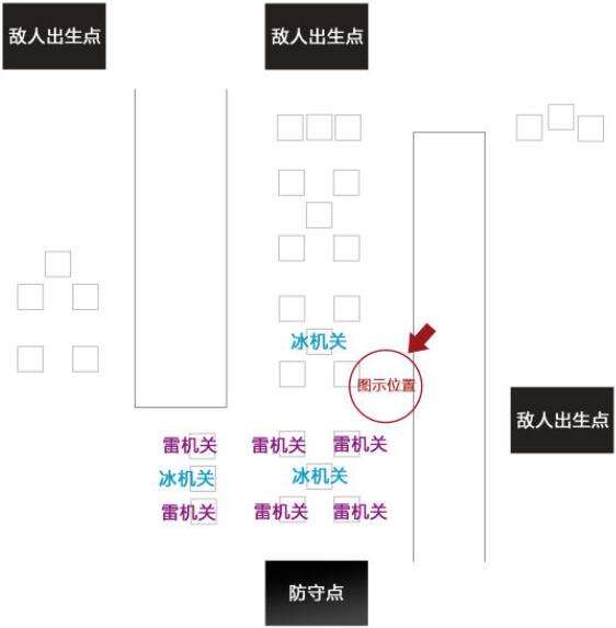 我们在如图所示的位置添加雷机关六个以及冰机关三个。