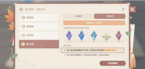 原神最近的新活动机关棋谭已经全部开放了,对于有些小伙伴来说还是有一些难度的。原神机关棋谭春几回怎么顺利通关?原神机关棋谭春几回需要玩家选择哪些灵签?接下来就给大家介绍原神机关棋谭春几回火列星屯满分攻略,想了解原神机关棋谭春几回火列星屯怎么拿满奖励或者原神机关棋谭春几回火列星屯怎么拿到满分的小伙伴,快来一起看看吧。