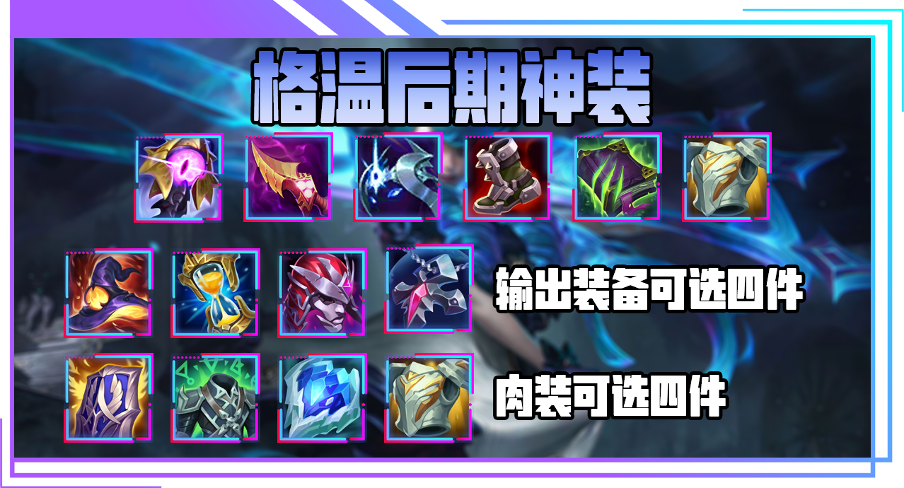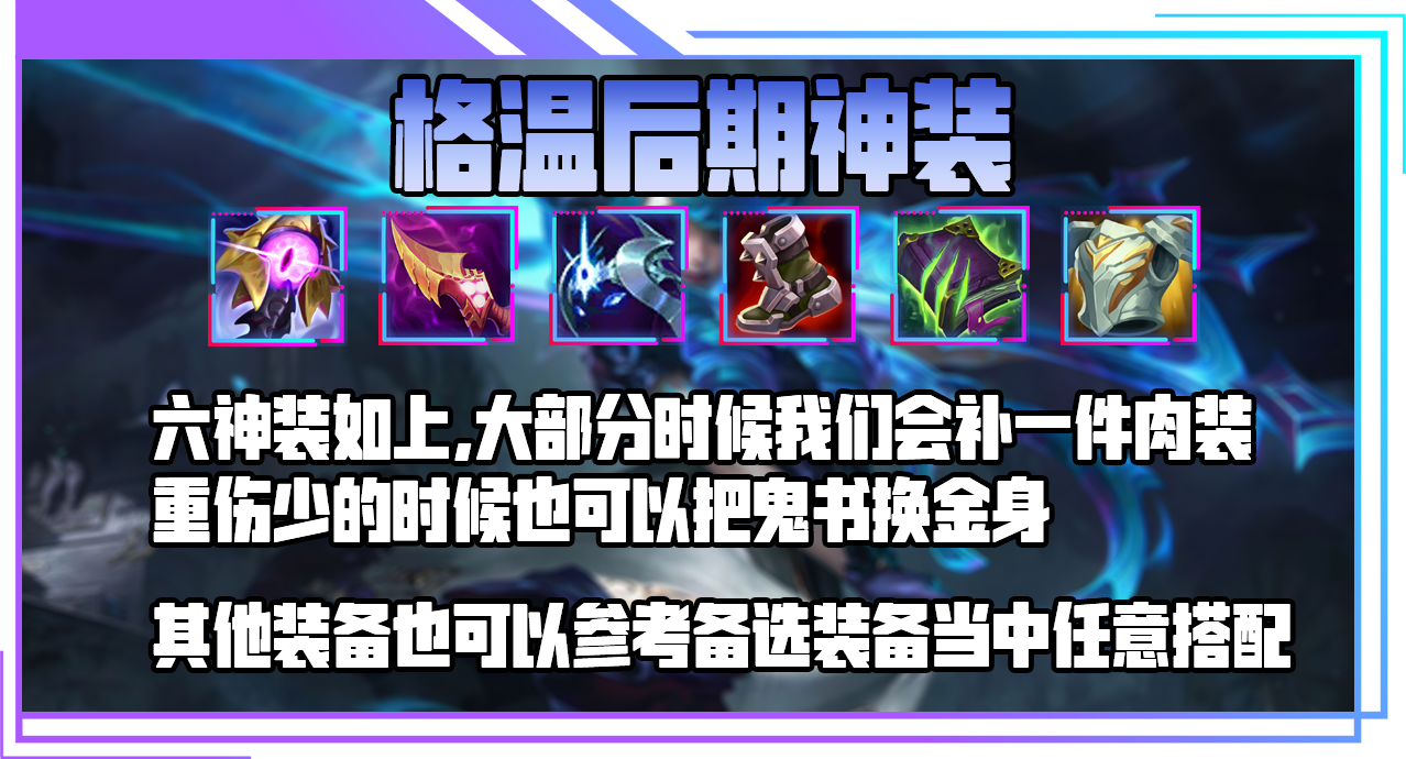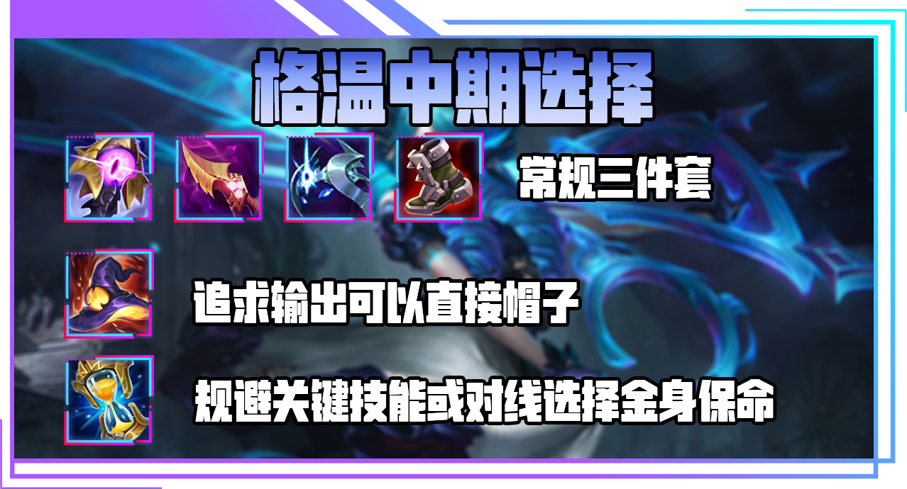 所有格温适合的防御装备都在这里:石像鬼、兰顿、振奋铠甲、恶魔之拥、冰心、女妖面纱。这些装备在均势局或者后期可以很好的帮助你生存。