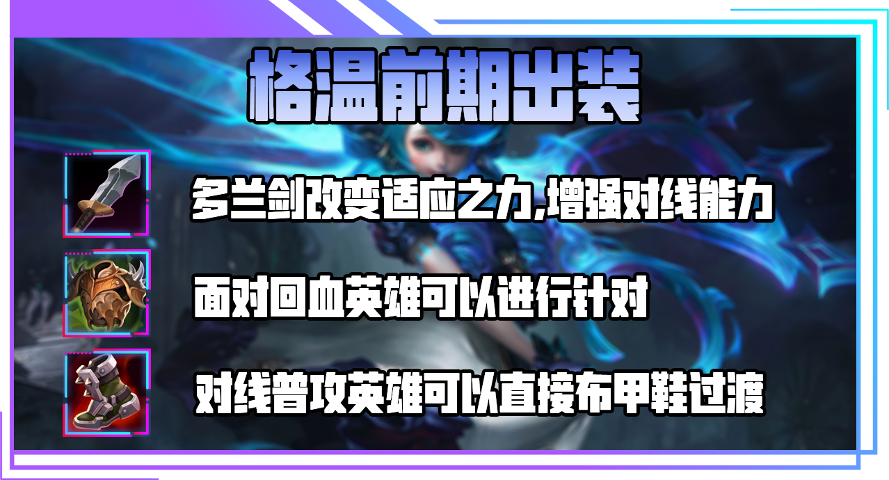 LOLS12格温出装推荐出门装多兰剑加红药,对线保持自己生命值,神话装备选择峡谷制造者,提高爆发伤害,之后对面有回复就出纳什,进一步提高伤害,然后出金身,防止对面集火秒掉自己。