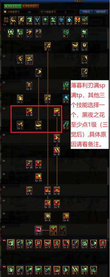 因此这四个技能的选择为:薄暮利刃满tp满sp,其他三个技能选择一个,黑夜之花至少点1级(三觉后),如果黑夜之花点满的话,则至少需要点1级tp。