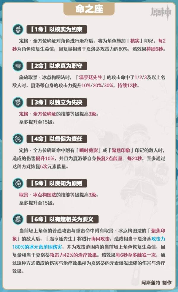 ◆总的来说,夏洛蒂的命座兼具了优化功能性和提高夏洛蒂自身的属性两种效果,其中以4命优化循环、6命发动追加冰伤和额外治疗为提升不错的效果。对于打算抽取后培养的旅行者而言4星角色的命座推荐越高越好。