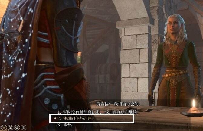 接着回到1楼与贾希拉对话,第一个选项1234随意,第二个选项选2,这里之前如果没有了解贾希拉相关故事的看官们可以补充一波剧情,选项无关剧情发展,随意即可