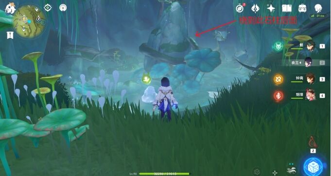 通过林中暗道来到新的空间,看到一个巨大的石柱,绕到石柱后方,发现又有一个林中黯道(法留纳神机必须调到晴)