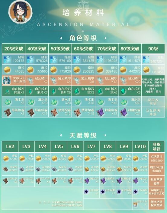治疗量与下落攻击的增伤都与闲云的攻击力有直接关系,闲云的等级突破属性是攻击力加成,所以在培养时,建议角色等级80级突破,资源充足时可直接升至90级,附上角色培养所需材料一览图。