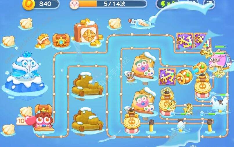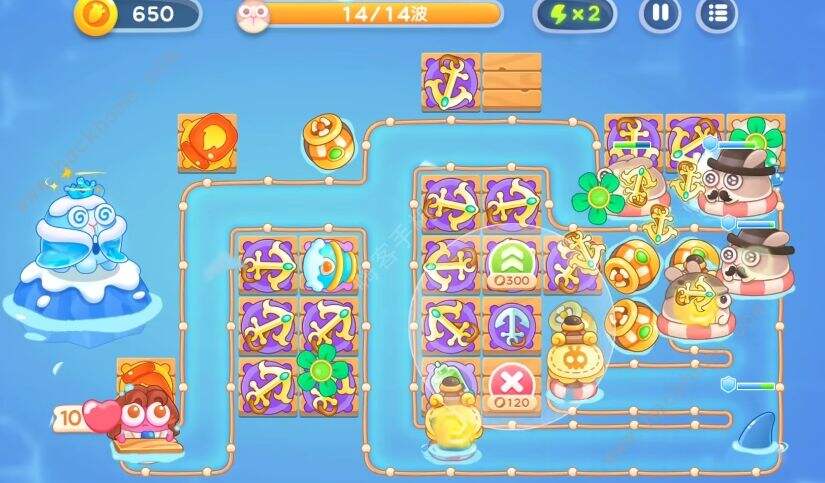 右侧上方加一船锚升一级,盯好冰冻兔,少冻炮塔,此时船锚升满级
