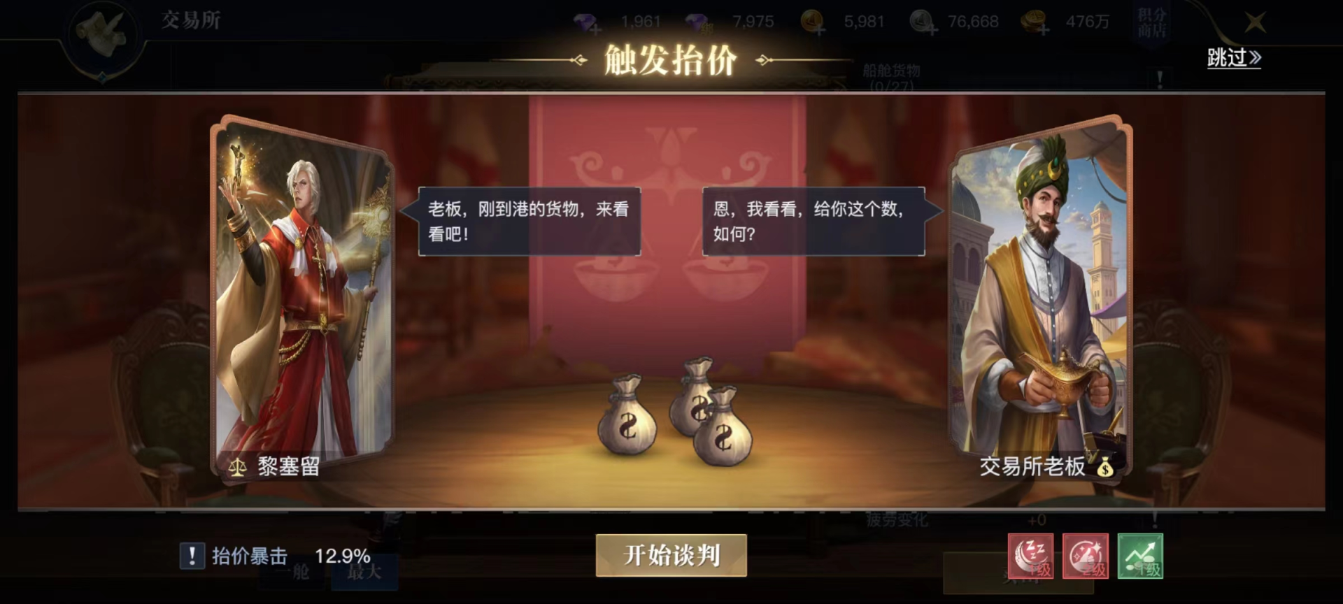 出售货物时,有概率触发议价事件;购买货物时,有概率触发砍价事件。出现概率和效果受到航海士、船只等多重因素影响。此外,不同港口的贸易店老板拥有不同的特性,诸如语言以及兴趣等等,也会对最终价格产生影响。