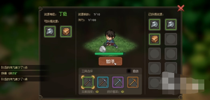 3、我们提升臂力经验与采到的物品等级无关,与资源本身等级有关,分甲乙丙丁四级,分别提供4/3/2/1点经验。人物先天属性只能提到10点,1级到2级要50点经验,2到3级要100点,3到4要150点,9到10级需要450点。