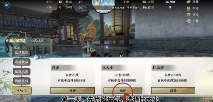 开局先选属性,尽量选择增加财富和人脉的属性,有【汴京人】最好,随机选项,凡是带风险的都不做,第一天先点开碰运气,选择【比大小】,然后点开逍遥快活,今天的5个时辰全部选择【去勾栏瓦肆看戏】,【混口饭吃】选择第三个【智能追风翼机械师】,【钱能生钱】,先看上面是否有传闻,没有传闻则正常点开市,第二天先点碰运气,选择【打麻将】。然后点开混的不错,把房子卖掉。