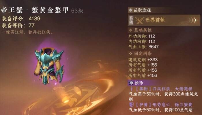 衣服:蟹八件(镜天阁探索获得)+蟹老板(东极海世界首领获得),然后加工一下就可以获得了,后续首通镜天阁禁阁的时候合成81独珍上衣即可。