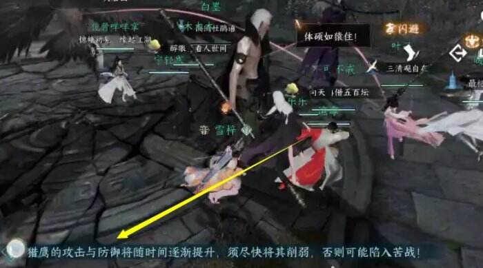 薛北鲲后方有一个鸟蛋,需要在没有战斗的情况下才能拾取,鸟蛋可以出示给猎鹰,会让猎鹰伤害稍微变高,组队推荐:2铁衣,3素问,3神相,3血河,1九灵,薛北鲲和猎鹰弱点属性为火,建议大家携带伤害比较高的绝技,例如:剑破乾坤、钧天浩意、残心三绝剑、万剑诀等,薛北鲲是没有狂暴时间限制,只要懂一点机制就能过。