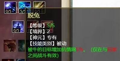 强牛第二层有三个技能,分别是:穿杨(任务专用,为被牛的单位增加命中率),脱兔(PK专用,为被牛的单位增加抗情网),溯光(任务、PK通用,增加自身的反击次数)。