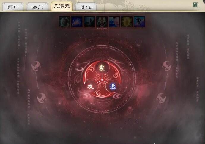 第一排是基础属性增强,一共6项,每项最高5点,必须点满20点,才能点亮震慑方向的天赋技能,男魔比女魔多增一项基础属性 ,为:云纵(增加敏捷点数),所以在同等加敏的装备下,男魔会比女魔敏稍高一点,震慑第一层有三个技能,如果你的天枢点不足60点,那选择“濯缨”就可以了。但如果你有60点以上的天枢点,要点出大招,则必须选择其中两项加满,“濯缨”为必点;震慑第二层三个技能,如果是PK想用震慑大招“覆雨”,则选择“吞象”和“平心”,天枢点不足60点,那选择“妙手”就可以了。