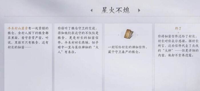 地点丰禾村,找到npc 燕捧牛,使用偷取技能拿到粮仓钥匙,来到粮仓,清理小怪,桌子上有一封信,找到村长燕驰,提交信件完成任务。
