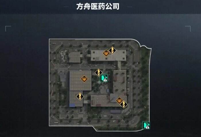 方舟医药公司主要由三部分组成,分别是北侧的1号区域C栋和D栋、西南侧的2号区域B座、东南侧的3号区域A座。全场共有2个撤离点、4个火金刷新点、3个高价值资源点和2个自动售卖机,危险等级较高,物资充足,收益等级较高。