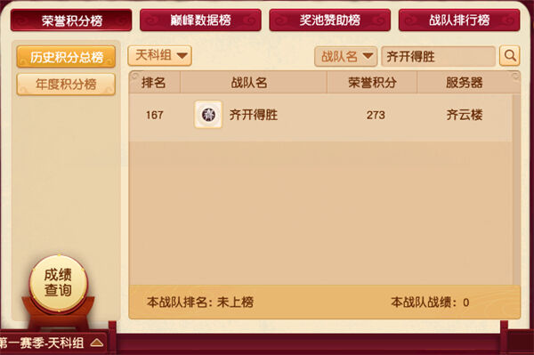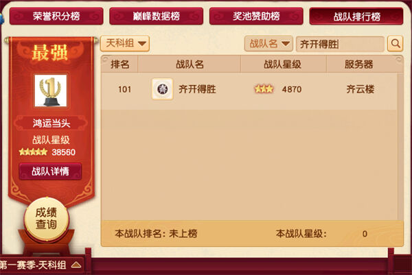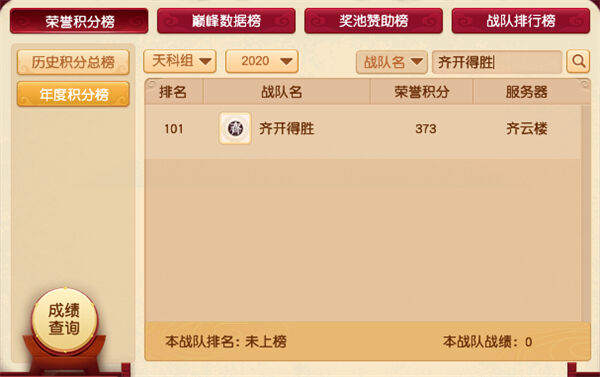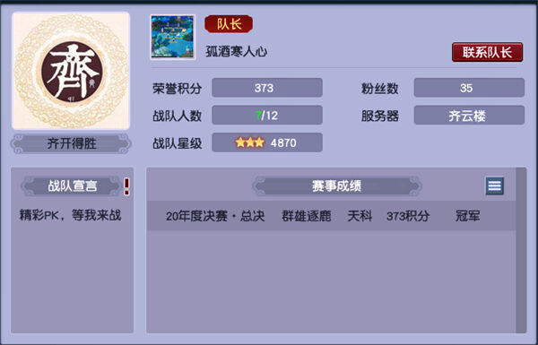 齐开得胜来自齐云楼,齐开得胜是为这次群雄逐鹿年度赛重新组建的战队,目前仅有三星。在战队排行榜上排名101,2020年度积分榜排名101,历史积分榜排名167。