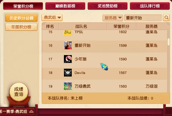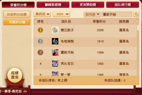 目前,重新开始是勇武组战队排行榜上排名第13的五星战队。另外,重新开始在2020年度积分榜和历史积分榜上分别排在第三和第16位,从榜单的名次来看,重新开始今年的势头还是相当猛的。