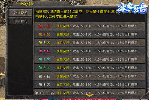 沙巴克争夺需捐献灵符才可以进入皇宫,胜者将获得奖池中的灵符奖励。沙巴克奖励更丰厚,战火更猛烈,行会兄弟为沙城最高荣誉而战,争当沙城霸主。
