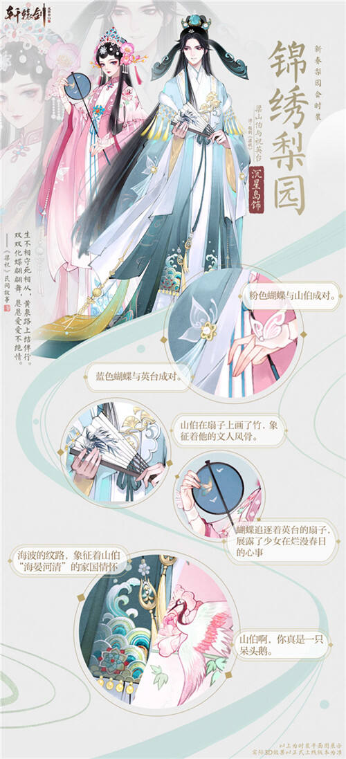 山伯衣饰上的海波纹路,象征着他海晏河清的家国情怀,英台的扇子,则展露了少女在烂漫春日里的心事。成双成对的蝴蝶在锦绣霓裳上翩跹起舞,期待少侠也能在云山世界中,找寻到你的情缘知己。