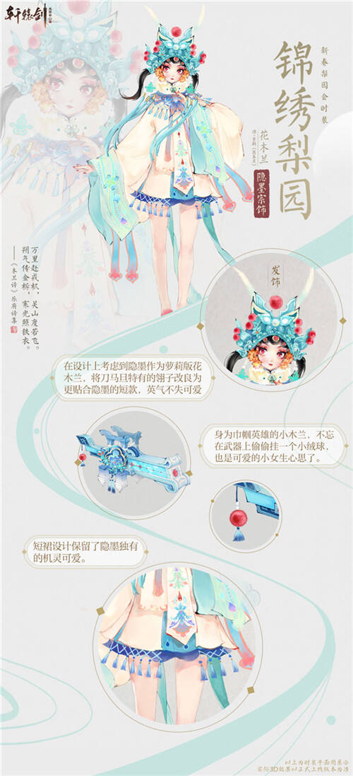 俏皮可爱的隐墨宗化身京剧版《花木兰》,让人惊喜非常。美术团队将刀马旦特有的翎子改良为更贴合隐墨的短款,并且为了保留萝莉的机灵可爱,武器与短裙上都进行了独特设计,让小木兰英气不失可爱。