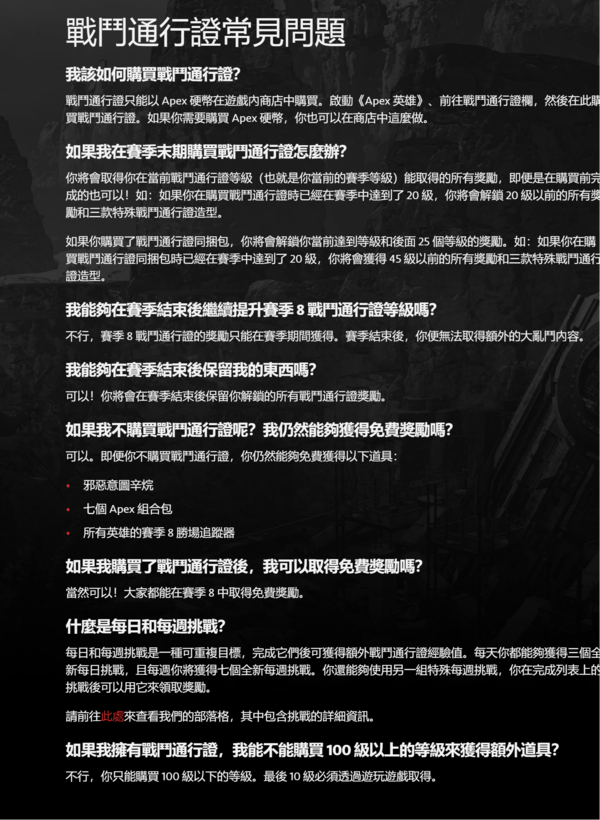 “通过完成每日与每周挑战来获得Apex组合包、经验值加成与造型等独特奖励。使用25级解锁的班加罗尔“偏激行为”传说级造型来让大家记住你。使用50级解锁的生命线“坏到骨子里”传说级造型来展现你凶恶的一面。达到100级后,你将会解锁“DMR X-1”反应式长弓,而且一路上还有许多其他精彩奖励:音乐包、载入画面、跳伞表情、台词和其他更多内容!取得同捆包(+65% 额外价值)来立即解锁前25级,使用赛季8战斗通行证来换上亮丽的装扮。”
